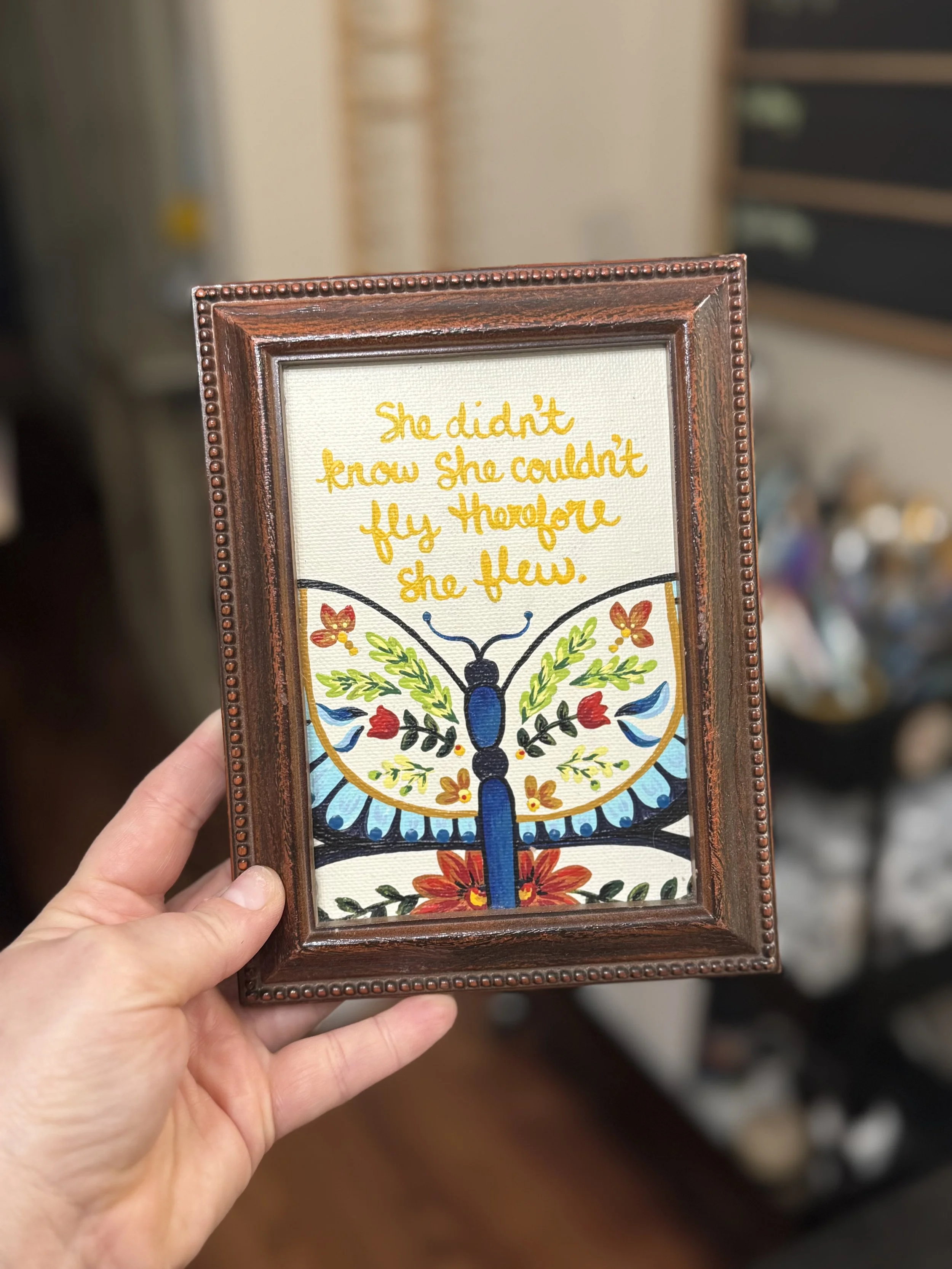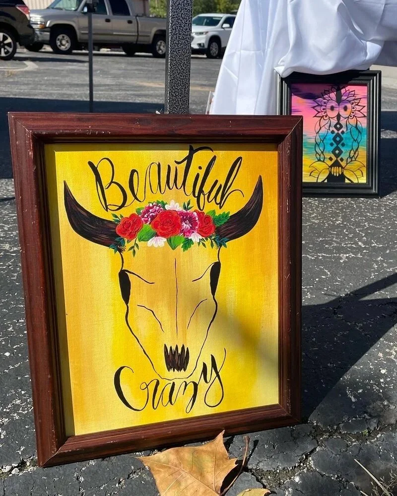 paintings Acrylic paintings are done on recycled canvas, wood or canvas board framed in thrifted, artfully chosen frames.